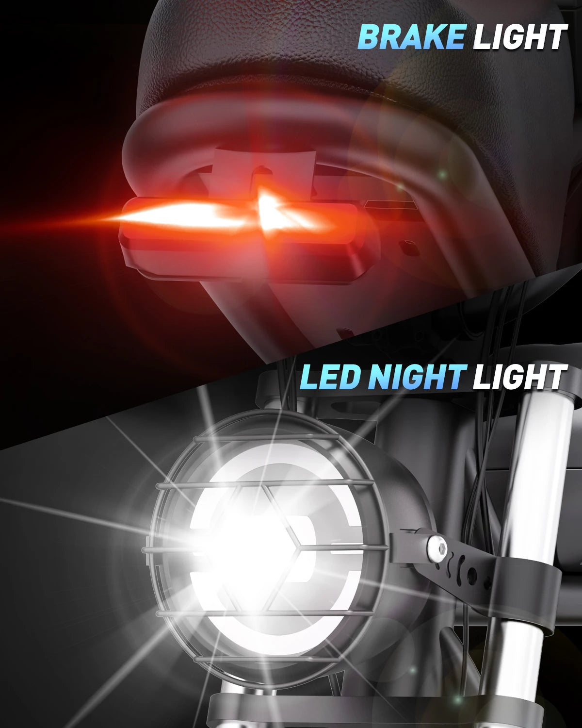 Introducing our vintage-inspired electric bike for adults, combining classic aesthetics and modern technology. The durable frame ensures lightweight performance and long-lasting durability, while the matte finish adds a touch of luxury. With sleek lines, sharp LED headlights, and a commanding front face, this dirt bike exudes confidence. Its wide body and sturdy chassis provide exceptional stability on any terrain.Turn heads wherever you go