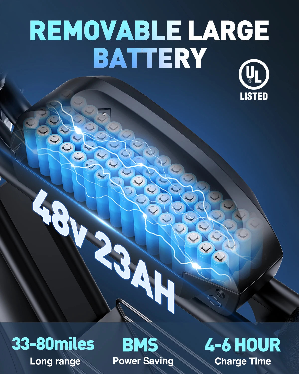 The electric dirt bike for adults comes with a removable 48 V/23 Ah battery. It can be quickly charged in 4-6 hours and has a longer lifespan. With a full charge, it can cover a range of 80 miles(assisted riding 55-80 mile and throttle mode 30-55 mile),allowing you to go further on your journeys. The removable battery also offers convenience as you can easily bring it home or to the office for recharging
