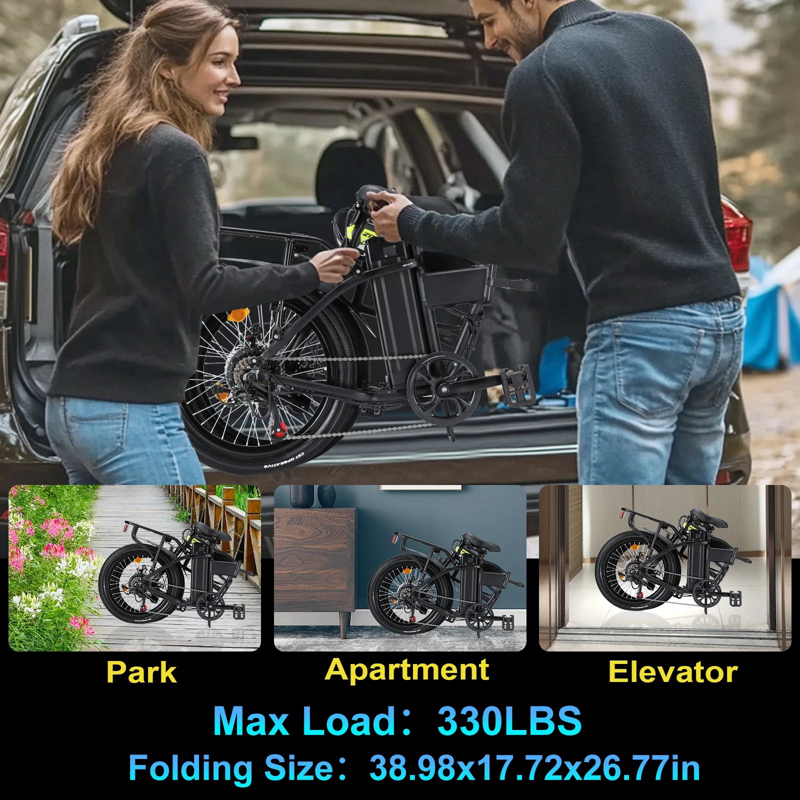 Sleek & Foldable Design for Easy Storage β Designed with 20-inch fat tires, this foldable electric bike provides excellent grip and stability. The aluminuml frame ensures both durability and lightweight portability. Featuring a quick-folding mechanism, this folding electric bike is easy to carry and store. The smart LCD display enhances your riding experience with real-time data. Supports up to 300 lbs.