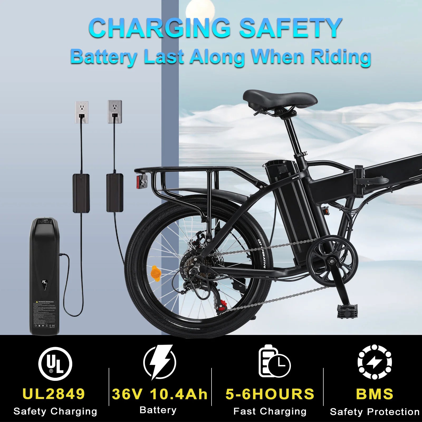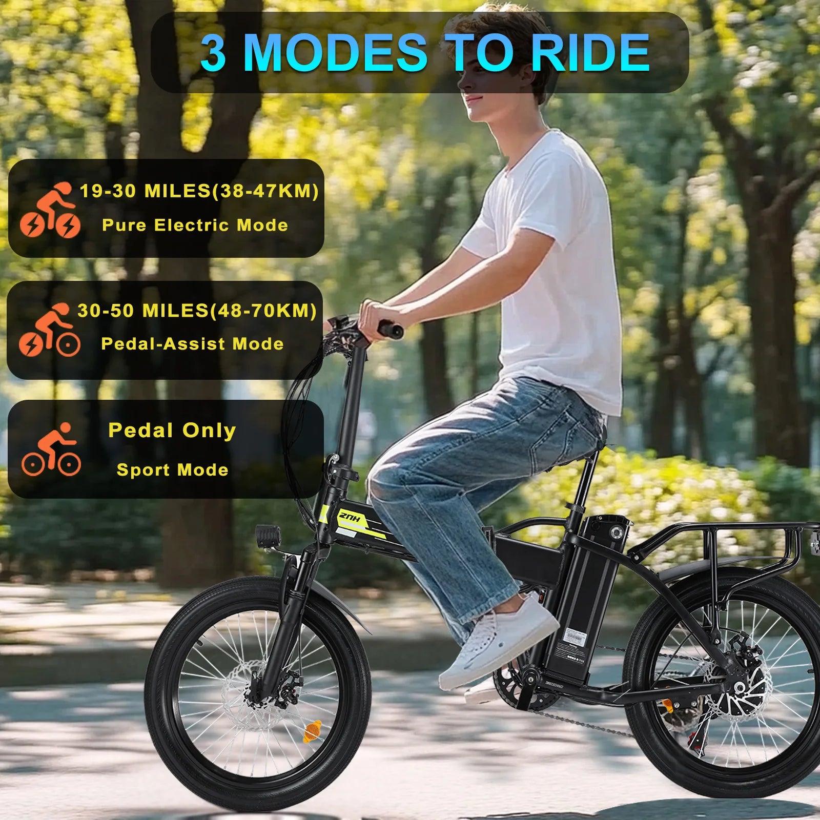 This foldable electric bike features a 500W peak motor with a top speed of 20 MPH and 30-50 miles range powered by a 10.4Ah/36V removable battery. Its 20-inch wheels, lightweight carbon steel frame, and smart LCD display offer stability, strength, and convenience.